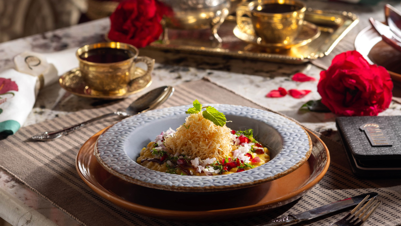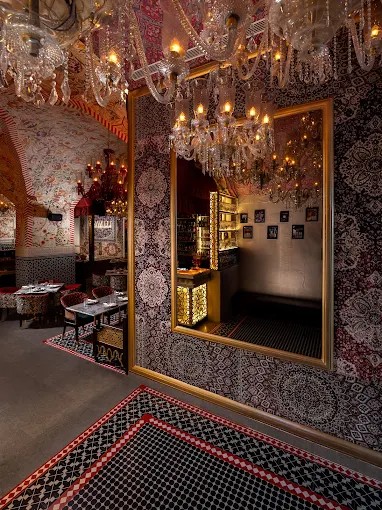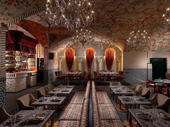 Qavalli’s design draws on Moroccan and Indo-Islamic influences. Guests are welcomed into a gold-and-auburn sanctuary featuring.